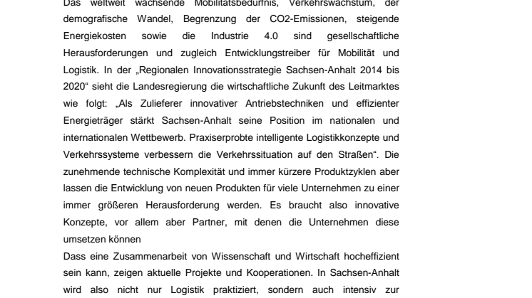 Das weltweit wachsende Mobilitätsbedürfnis, Verkehrswachstum, der demografische Wandel, Begrenzung der CO2-Emissionen, steigende Energiekosten sowie die Industrie 4.0 sind gesellschaftliche Herausforderungen und zugleich Entwicklungstreiber für Mobilität und Logistik. In der „Regionalen Innovationsstrategie Sachsen-Anhalt 2014 bis 2020“ sieht die Landesregierung die wirtschaftliche Zukunft des Leitmarktes wie folgt: „Als Zulieferer innovativer Antriebstechniken und effizienter Energieträger stärkt Sachsen-Anhalt seine Position im nationalen und internationalen Wettbewerb. Praxiserprobte intelligente Logistikkonzepte und Verkehrssysteme verbessern die Verkehrssituation auf den Straßen“. Die zunehmende technische Komplexität und immer kürzere Produktzyklen aber lassen die Entwicklung von neuen Produkten für viele Unternehmen zu einer immer größeren Herausforderung werden. Es braucht also innovative Konzepte, vor allem aber Partner, mit denen die Unternehmen diese umsetzen können