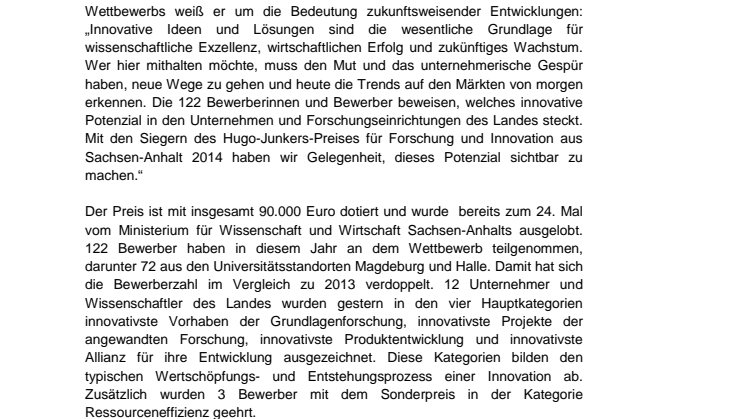 Der Preis ist mit insgesamt 90.000 Euro dotiert und wurde bereits zum 24. Mal vom Ministerium für Wissenschaft und Wirtschaft Sachsen-Anhalts ausgelobt. 122 Bewerber haben in diesem Jahr an dem Wettbewerb teilgenommen, darunter 72 aus den Universitätsstandorten Magdeburg und Halle. Damit hat sich die Bewerberzahl im Vergleich zu 2013 verdoppelt. 12 Unternehmer und Wissenschaftler des Landes wurden gestern in den vier Hauptkategorien innovativste Vorhaben der Grundlagenforschung, innovativste Projekte der angewandten Forschung, innovativste Produktentwicklung und innovativste Allianz für ihre Entwicklung ausgezeichnet. Diese Kategorien bilden den typischen Wertschöpfungs- und Entstehungsprozess einer Innovation ab. Zusätzlich wurden 3 Bewerber mit dem Sonderpreis in der Kategorie Ressourceneffizienz geehrt.