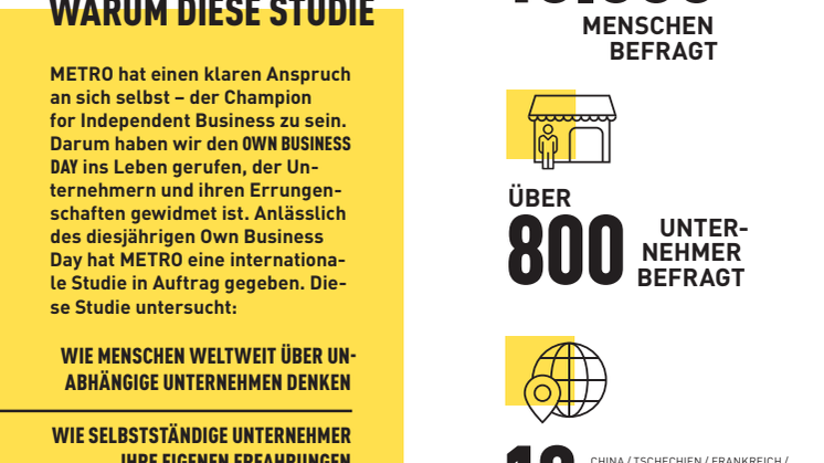 Die METRO International Own Business Study wurde anlässlich des zweiten METRO Own Business Day am 10. Oktober 2017 durchgeführt. Der Own Business Day richtet sich an alle unabhängigen Unternehmen, darunter 21 Millionen gewerbliche METRO Kunden. Das Unternehmen möchte den Tag als globale Veranstaltung etablieren, die jedes Jahr am zweiten Dienstag im Oktober stattfinden soll. Ziel ist es, den selbstständigen Unternehmen die Aufmerksamkeit und Anerkennung zukommen zu lassen, die sie verdienen, und ihre Bekanntheit in ihren Gemeinden zu fördern.