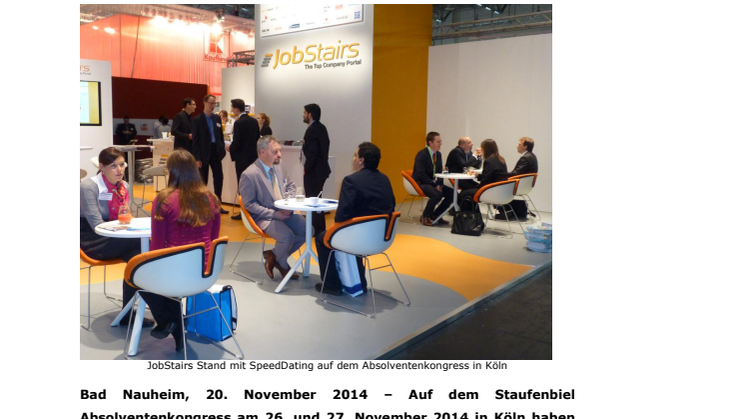 Bad Nauheim, 20. November 2014 – Auf dem Staufenbiel Absolventenkongress am 26. und 27. November 2014 in Köln haben Absolventen wieder die besondere Chance, innerhalb weniger Minuten mit den Recruitern gleich mehrerer Top-Unternehmen ins Gespräch zu kommen. Denn die Jobbörse JobStairs bietet auf ihrem Stand zum zweiten Mal SpeedDatings mit ihren hochkarätigen Partnerunternehmen an. Die Teilnehmerzahl ist begrenzt. Anmeldungen sind ab sofort möglich.