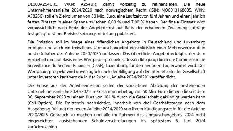 Die Emission soll im Wege eines öffentlichen Angebots in Deutschland und Luxemburg erfolgen und auch ein freiwilliges Umtauschangebot einschließlich einer Mehrerwerbsoption an die Inhaber der Anleihe 2020/2025 umfassen. Das öffentliche Angebot erfolgt unter dem Vorbehalt und auf Basis eines Wertpapierprospekts, dessen Billigung durch die Commission de Surveillance du Secteur Financier (CSSF), Luxemburg, für den heutigen Tag erwartet wird. Der Wertpapierprospekt wird unverzüglich nach der Billigung auf der Internetseite der Gesellschaft unter investoren.karlsberg.de in der Rubrik „Anleihe 2024/2029“ veröffentlicht.