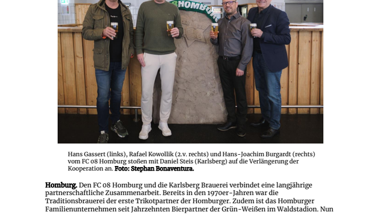 Homburg. Den FC 08 Homburg und die Karlsberg Brauerei verbindet eine langjährige partnerschaftliche Zusammenarbeit. Bereits in den 1970er-Jahren war die Traditionsbrauerei der erste Trikotpartner der Homburger. Zudem ist das Homburger Familienunternehmen seit Jahrzehnten Bierpartner der Grün-Weißen im Waldstadion. Nun wurde die Kooperation mit der Karlsberg Brauerei um drei weitere Jahre bis 2027 verlängert.
