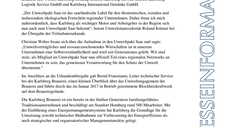 „Der Umweltpakt Saar ist das saarländische Label für den ökonomischen, sozialen und insbesondere ökologischen Fortschritt regionaler Unternehmen. Daher freue ich mich außerordentlich, dass Karlsberg als wichtiger Motor und Arbeitgeber in der Region sich nun auch zum Umweltpakt Saar bekennt“, betont Umweltstaatssekretär Roland Krämer bei der Übergabe der Teilnehmerurkunde.