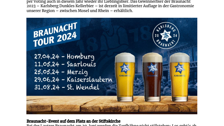 Nach der Lautrer Braunacht geht die diesjährige Braunacht-Tour Ende August in die finale Runde. Am 31. August findet die Karlsberg Braunacht mit jeder Menge Live- Musik und den drei neuen Bieren in St. Wendel statt.