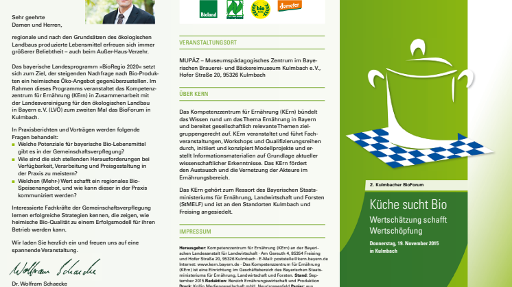 Das BioForum wird im Rahmen des Landesprogramms „BioRegio Bayern 2020“ veranstaltet. Kern dieser Initiative ist ein ganzheitlicher Ansatz in den Bereichen Bildung, Beratung, Förderung, Vermarktung und Forschung. „Gerade in der Gemeinschaftsverpflegung, in der täglich große Mengen an Mahlzeiten frisch zubereitet werden, können Essensgäste für die Themen Regionalität, Ökologie und Gesundheit sensibilisiert werden“, so Dr. Wolfram Schaecke, Leiter des KErn.