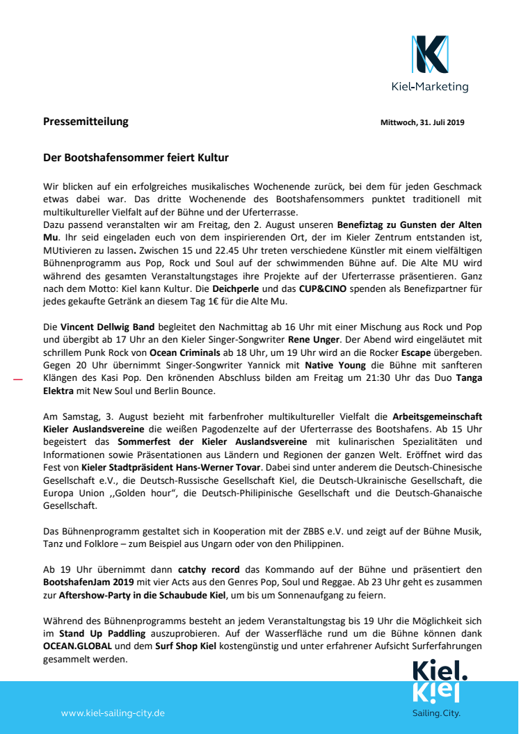 In dieser PM wird das Programm des dritten Wochenendes des Kieler Bootshafensommers bekannt gegeben. An diesem Wochenende findet der Benefiztag zu Gunsten der Alten Mu statt.