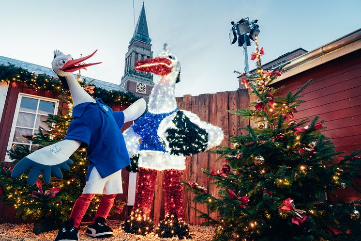 Maskottchen Stolle (ein Storch) leuchtet im Kieler Weihnachtsdorf