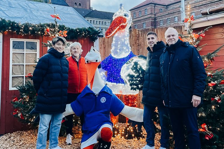 Maskottchen Stolle (ein Storch) leuchtet im Kieler Weihnachtsdorf