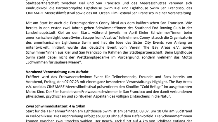 Das Lighthouse Swim Open Water hat sich im Kieler Kalender fest etabliert. So haben sich für Samstag, 08. Juli 2023 knapp 200 Sportler*innen gemeldet, die sich der sportlichen Herausforderung stellen und gleichzeitig gemeinsam ein Zeichen für den Schutz der Meere setzen wollen. Im Zeichen der Städtepartnerschaft zwischen Kiel und San Francisco und des Meeresschutzes vereinen sich eindrucksvoll die Partnerprojekte Lighthouse Swim Kiel und Lighthouse Swim San Francisco, das CINEMARE Meeresfilmfestival sowie das Int. Ocean Film Festival San Francisco in einer Veranstaltung.