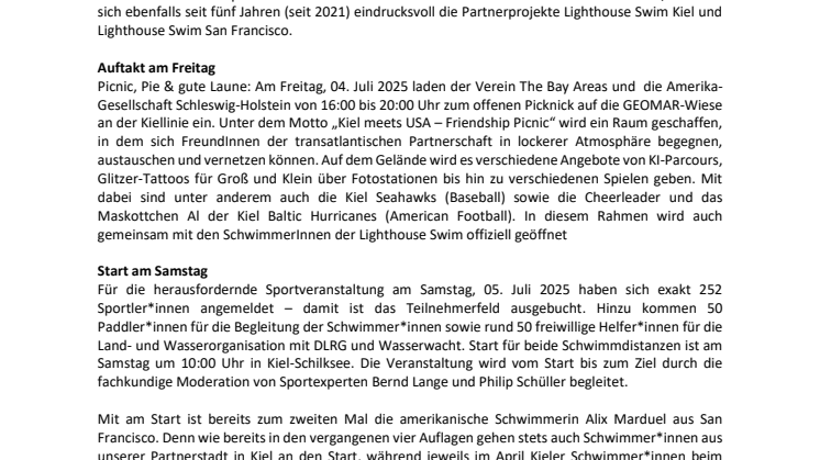 Das Lighthouse Swim Open Water ist im Kieler Kalender fest verankert und feiert 2025 seinen fünften Geburtstag. Schon Monate vorher war das Teilnehmerfeld auf beiden Distanzen restlos ausgebucht. Im Zeichen der Städtepartnerschaft zwischen Kiel und San Francisco mit dem Meeresschutz, vereinen sich ebenfalls seit fünf Jahren (seit 2021) eindrucksvoll die Partnerprojekte Lighthouse Swim Kiel und Lighthouse Swim San Francisco.