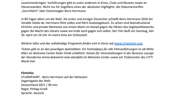 Vom 26. April bis 1. Mai 2022 laufen auf den Leinwänden der Landeshauptstadt Kiel mehr als 20 spannende Filme, die thematisch Meeres- und Umweltschutz, Sport, Kultur und Wissenschaft zusammenbringen. Vorführungen gibt es unter anderem in Kinos, Clubs und Museen sowie an Häuserwänden. Nicht nur für Segelfans eines der absoluten Highlights: der Dokumentarfilm „Sturmfahrt“ über Extremsegler Boris Herrmann.