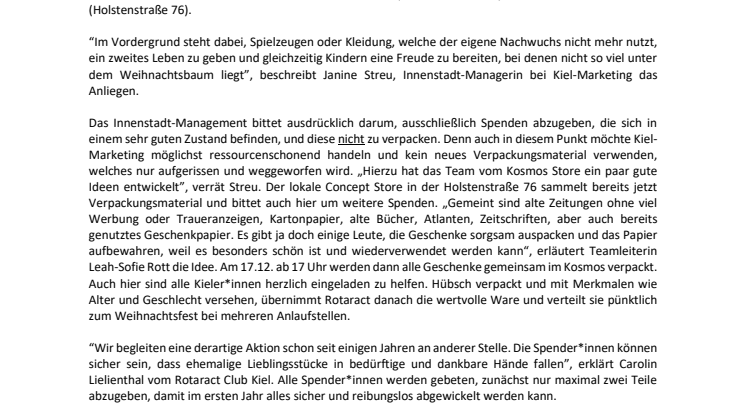 Das Innenstadt-Management bittet ausdrücklich darum, ausschließlich Spenden abzugeben, die sich in einem sehr guten Zustand befinden, und diese nicht zu verpacken. Denn auch in diesem Punkt möchte Kiel-Marketing möglichst ressourcenschonend handeln und kein neues Verpackungsmaterial verwenden, welches nur aufgerissen und weggeworfen wird. „Hierzu hat das Team vom Kosmos Store ein paar gute Ideen entwickelt”, verrät Streu. Der lokale Concept Store in der Holstenstraße 76 sammelt bereits jetzt Verpackungsmaterial und bittet auch hier um weitere Spenden. „Gemeint sind alte Zeitungen ohne viel Werbung oder Traueranzeigen, Kartonpapier, alte Bücher, Atlanten, Zeitschriften, aber auch bereits genutztes Geschenkpapier. Es gibt ja doch einige Leute, die Geschenke sorgsam auspacken und das Papier aufbewahren, weil es besonders schön ist und wiederverwendet werden kann“, erläutert Teamleiterin Leah-Sofie Rott die Idee. Am 17.12. ab 17 Uhr werden dann alle Geschenke gemeinsam im Kosmos verpackt. Auch hier sind alle Kieler*innen herzlich eingeladen zu helfen. Hübsch verpackt und mit Merkmalen wie Alter und Geschlecht versehen, übernimmt Rotaract danach die wertvolle Ware und verteilt sie pünktlich zum Weihnachtsfest bei mehreren Anlaufstellen.