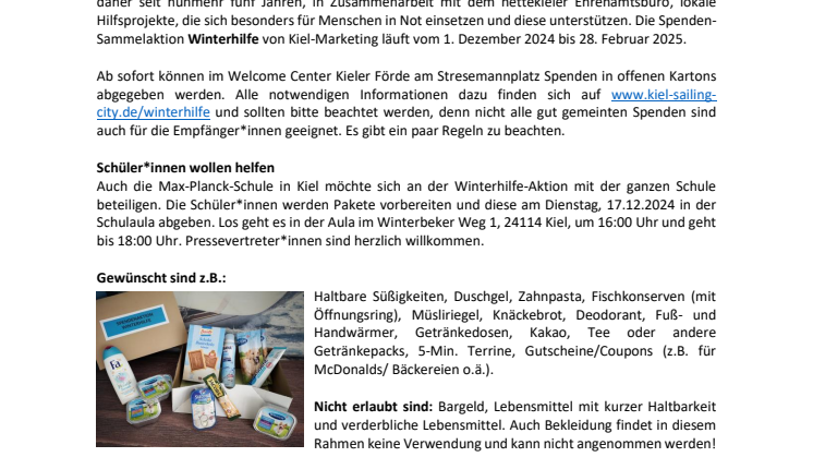 Auch die Max-Planck-Schule in Kiel möchte sich an der Winterhilfe-Aktion mit der ganzen Schule beteiligen. Die Schüler*innen werden Pakete vorbereiten und diese am Dienstag, 17.12.2024 in der Schulaula abgeben. Los geht es in der Aula im Winterbeker Weg 1, 24114 Kiel, um 16:00 Uhr und geht bis 18:00 Uhr. Pressevertreter*innen sind herzlich willkommen.