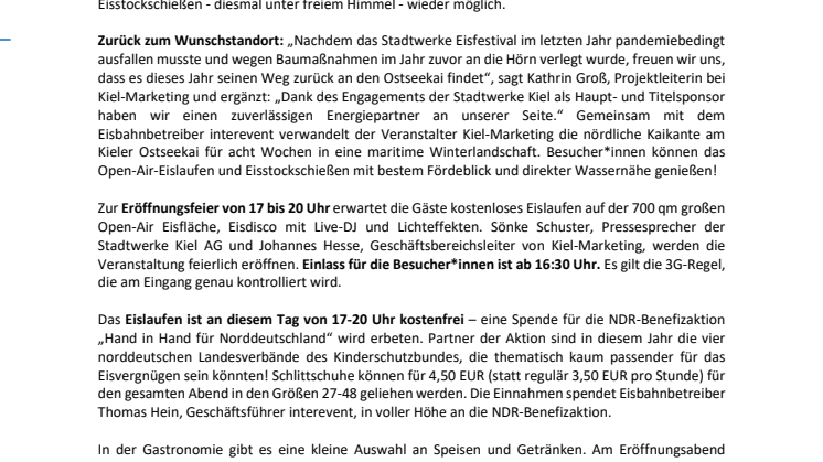 Zur Eröffnungsfeier von 17 bis 20 Uhr erwartet die Gäste kostenloses Eislaufen auf der 700 qm großen Open-Air Eisfläche, Eisdisco mit Live-DJ und Lichteffekten. Sönke Schuster, Pressesprecher der Stadtwerke Kiel AG und Johannes Hesse, Geschäftsbereichsleiter von Kiel-Marketing, werden die Veranstaltung feierlich eröffnen. Einlass für die Besucher*innen ist ab 16:30 Uhr. Es gilt die 3G-Regel, die am Eingang genau kontrolliert wird.