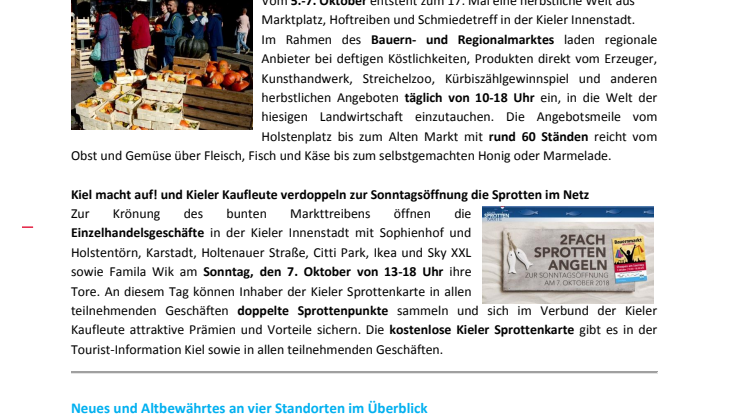 Zur Krönung des bunten Markttreibens öffnen die Einzelhandelsgeschäfte in der Kieler Innenstadt mit Sophienhof und Holstentörn, Karstadt, Holtenauer Straße, Citti Park, Ikea und Sky XXL sowie Famila Wik am Sonntag, den 7. Oktober von 13-18 Uhr ihre Tore. An diesem Tag können Inhaber der Kieler Sprottenkarte in allen teilnehmenden Geschäften doppelte Sprottenpunkte sammeln und sich im Verbund der Kieler Kaufleute attraktive Prämien und Vorteile sichern. Die kostenlose Kieler Sprottenkarte gibt es in der Tourist-Information Kiel sowie in allen teilnehmenden Geschäften.