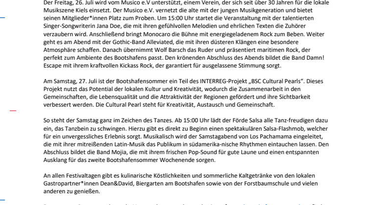 Nach einem gelungen Auftakt zum diesjährigen Bootshafensommer im Herzen Kiels, geht es am Freitag und Samstag ins zweite Wochenende. Am 26. und 27. Juli, geht es für die Besucher*innen mit einem vielfältigen Programm weiter, das sowohl Musikliebhaber*innen als auch Tanzbegeisterte in Euphorie versetzen wird.