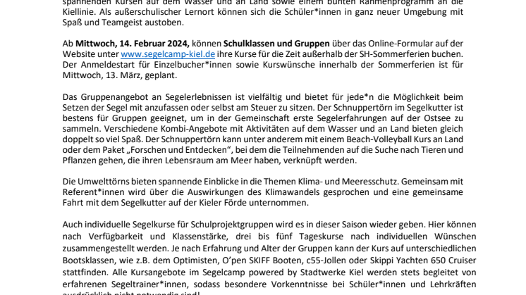 Ab Mittwoch, 14. Februar 2024, können Schulklassen und Gruppen über das Online-Formular auf der Website unter www.segelcamp-kiel.deihre Kurse für die Zeit außerhalb der SH-Sommerferien buchen. Der Anmeldestart für Einzelbucher*innen sowie Kurswünsche innerhalb der Sommerferien ist für Mittwoch, 13. März, geplant.