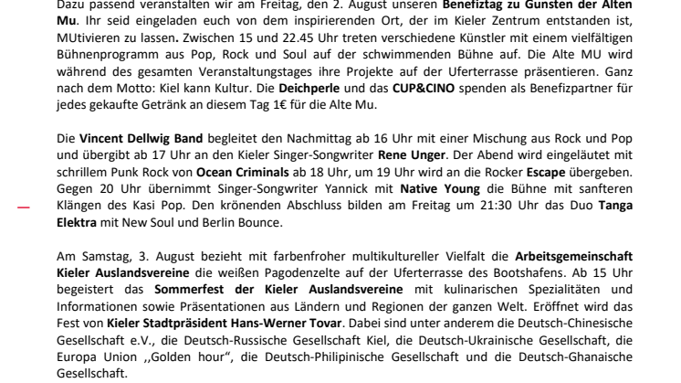 Dazu passend veranstalten wir am Freitag, den 2. August unseren Benefiztag zu Gunsten der Alten Mu.Ihr seid eingeladen euch von dem inspirierenden Ort, der im Kieler Zentrum entstanden ist, MUtivieren zu lassen. Zwischen 15 und 22.45 Uhr treten verschiedene Künstler mit einem vielfältigen Bühnenprogramm aus Pop, Rock und Soul auf der schwimmenden Bühne auf. Die Alte MU wird während des gesamten Veranstaltungstages ihre Projekte auf der Uferterrasse präsentieren. Ganz nach dem Motto: Kiel kann Kultur. Die Deichperle und das CUP&CINO spenden als Benefizpartner für jedes gekaufte Getränk an diesem Tag 1€ für die Alte Mu.