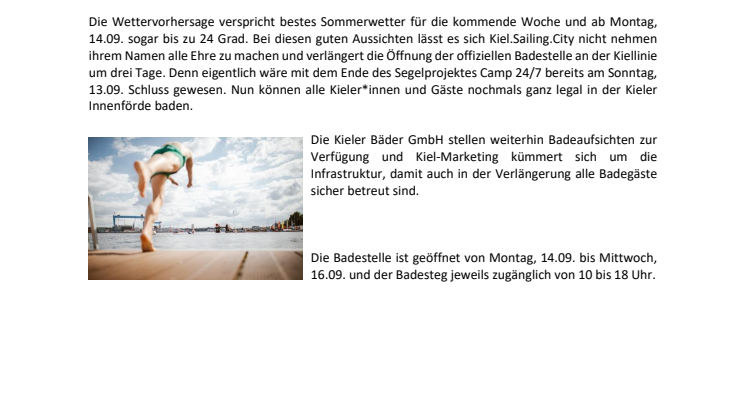 Die Wettervorhersage verspricht bestes Sommerwetter für die kommende Woche und ab Montag, 14.09. sogar bis zu 24 Grad. Bei diesen guten Aussichten lässt es sich Kiel.Sailing.City nicht nehmen ihrem Namen alle Ehre zu machen und verlängert die Öffnung der offiziellen Badestelle an der Kiellinie um drei Tage. Denn eigentlich wäre mit dem Ende des Segelprojektes Camp 24/7 bereits am Sonntag, 13.09. Schluss gewesen. Nun können alle Kieler*innen und Gäste nochmals ganz legal in der Kieler Innenförde baden.