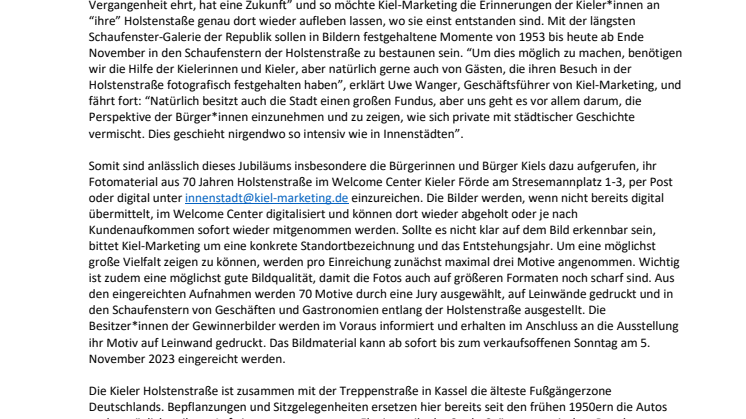 Mit der Holstenstraße wird eine der ältesten Fußgängerzonen Deutschlands in diesem Jahr 70 Jahre alt. Sie kann auf eine bewegte Geschichte zurückblicken, symbolisierte lange die Blütezeit innerstädtischer Einkaufsstraßen in Deutschland und stellt sich aktuell den Herausforderungen der notwendigen Transformation hin zu einem Innenstadterlebnis der Zukunft. Schon Goethe wusste: “Nur wer seine Vergangenheit ehrt, hat eine Zukunft” und so möchte Kiel-Marketing die Erinnerungen der Kieler*innen an “ihre” Holstenstaße genau dort wieder aufleben lassen, wo sie einst entstanden sind. Mit der längsten Schaufenster-Galerie der Republik sollen in Bildern festgehaltene Momente von 1953 bis heute ab Ende November in den Schaufenstern der Holstenstraße zu bestaunen sein. “Um dies möglich zu machen, benötigen wir die Hilfe der Kielerinnen und Kieler, aber natürlich gerne auch von Gästen, die ihren Besuch in der Holstenstraße fotografisch festgehalten haben”, erklärt Uwe Wanger, Geschäftsführer von Kiel-Marketing, und fährt fort: “Natürlich besitzt auch die Stadt einen großen Fundus, aber uns geht es vor allem darum, die Perspektive der Bürger*innen einzunehmen und zu zeigen, wie sich private mit städtischer Geschichte vermischt. Dies geschieht nirgendwo so intensiv wie in Innenstädten”.