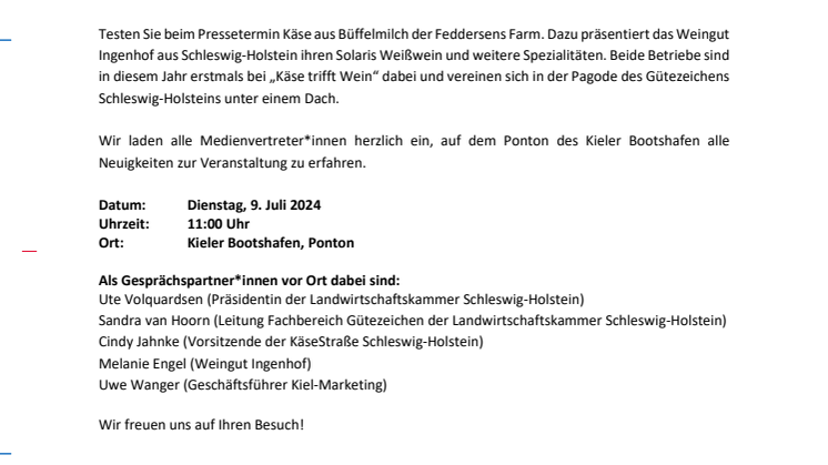 Der Genuss und kulinarische Vielfalt stehen am Wochenende vom 12.-14. Juli 2024 bei „Käse trifft Wein“ am Bootshafen im Vordergrund. Weingüter aus dem Süden Deutschlands treffen in Kiels schönster Mitte auf regionale Produkte der KäseStraße Schleswig-Holstein.