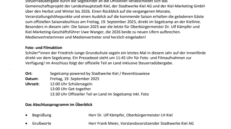 Die laufende Saison des Segelcamps an der Kiellinie neigt sich dem Ende zu. Mit der symbolischen Steuerradübergabe durch die Segelkinder an die Offiziellen verabschiedet sich das Gemeinschaftsprojekt der Landeshauptstadt Kiel, der Stadtwerke Kiel AG und der Kiel-Marketing GmbH über den Herbst und Winter bis 2026. Einen Rückblick auf die vergangenen Monate, Veranstaltungshöhepunkte und einen Ausblick auf die kommende Saison erhalten die geladenen Gäste zum offiziellen Saisonabschluss am Freitag, 19. September 2025, direkt im Segelcamp an der Kiellinie. Besonders in diesem Jahr: Die Saison 2025 war die letzte für Oberbürgermeister Dr. Ulf Kämpfer und Kiel-Marketing-Geschäftsführer Uwe Wanger, die 2026 beide zu neuen Ufern aufbrechen. Medienvertreterinnen und Medienvertreter sind herzlich eingeladen!