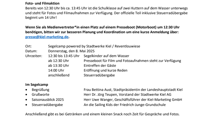 Wenn Sie als Medienvertreter*in einen Platz auf einem Presseboot (Motorboot) um 12:30 Uhr benötigen, bitten wir zur besseren Planung und Koordination um eine kurze Anmeldung über: presse@kiel-marketing.de.
