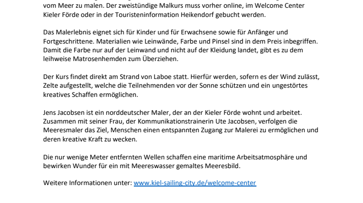 Der Malkurs „Malen am Meer – Meeresmaler“ mit Ute und Jens Jacobsen bietet ein einzigartiges Kunst-Erlebnis direkt an der Kieler Förde. Von Juni bis Ende September gibt es an sieben Sonntagen die Möglichkeit an dem Malkurs teilzunehmen und ein eigenes Bild vom Meer zu malen. Der zweistündige Malkurs muss vorher online, im Welcome Center Kieler Förde oder in der Touristeninformation Heikendorf gebucht werden.