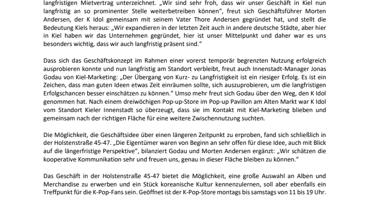 Gute Nachrichten für alle K-Pop-Fans! Der K-Pop-Store der K Idol GmbH, der im September 2022 vorerst als Zwischennutzung in der Holstenstraße 45-47 gestartet war, hat zu Anfang April 2024 einen langfristigen Mietvertrag unterzeichnet. „Wir sind sehr froh, dass wir unser Geschäft in Kiel nun langfristig an so prominenter Stelle weiterbetreiben können“, freut sich Geschäftsführer Morten Andersen, der K Idol gemeinsam mit seinem Vater Thore Andersen gegründet hat, und stellt die Bedeutung Kiels heraus: „Wir expandieren in der letzten Zeit auch in andere deutsche Städte, aber hier in Kiel haben wir das Unternehmen gegründet, hier ist unser Mittelpunkt und daher war es uns besonders wichtig, dass wir auch langfristig präsent sind.“