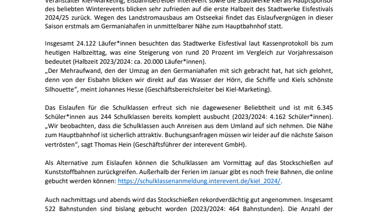 Veranstalter Kiel-Marketing, Eisbahnbetreiber interevent sowie die Stadtwerke Kiel als Hauptsponsor des beliebten Winterevents blicken sehr zufrieden auf die erste Halbzeit des Stadtwerke Eisfestivals 2024/25 zurück. Wegen des Landstromausbaus am Ostseekai findet das Eislaufvergnügen in dieser Saison erstmals am Germaniahafen in unmittelbarer Nähe zum Hauptbahnhof statt.