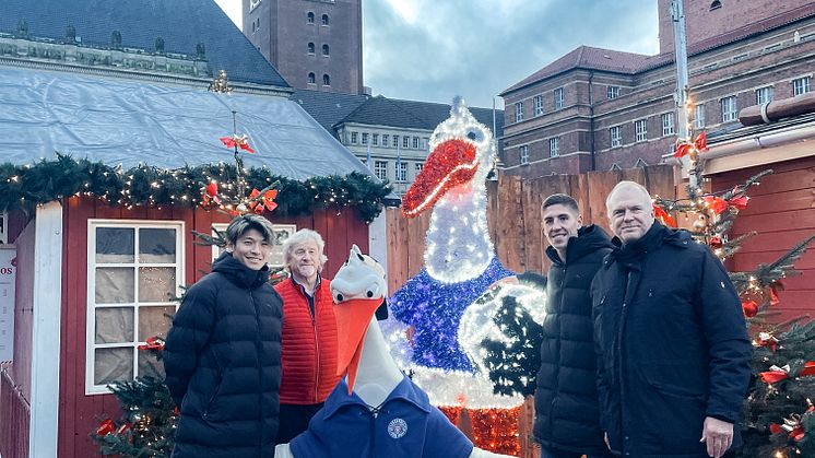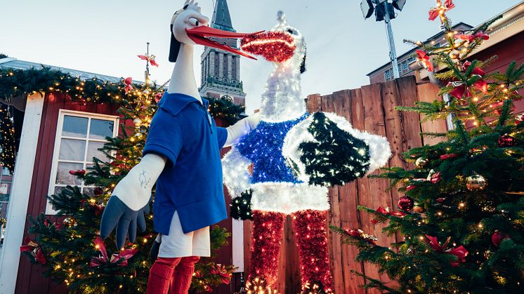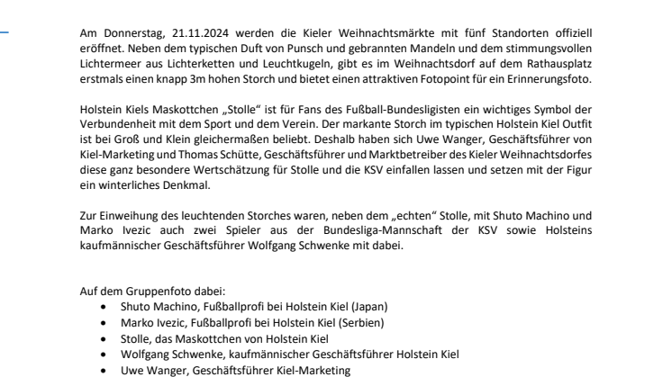 Holstein Kiels Maskottchen „Stolle“ ist für Fans des Fußball-Bundesligisten ein wichtiges Symbol der Verbundenheit mit dem Sport und dem Verein. Der markante Storch im typischen Holstein Kiel Outfit ist bei Groß und Klein gleichermaßen beliebt. Deshalb haben sich Uwe Wanger, Geschäftsführer von Kiel-Marketing und Thomas Schütte, Geschäftsführer und Marktbetreiber des Kieler Weihnachtsdorfes diese ganz besondere Wertschätzung für Stolle und die KSV einfallen lassen und setzen mit der Figur ein winterliches Denkmal.