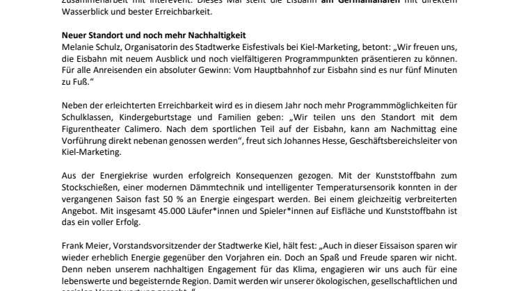 Neben der erleichterten Erreichbarkeit wird es in diesem Jahr noch mehr Programmmöglichkeiten für Schulklassen, Kindergeburtstage und Familien geben: „Wir teilen uns den Standort mit dem Figurentheater Calimero. Nach dem sportlichen Teil auf der Eisbahn, kann am Nachmittag eine Vorführung direkt nebenan genossen werden“, freut sich Johannes Hesse, Geschäftsbereichsleiter von Kiel-Marketing.