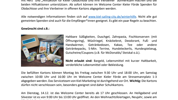 Die Spendenaktion läuft vorerst bis Ende Januar 2022 und wird von Kiel-Marketing e.V., Kieler helfen mit Herz, die Hilfsaktion für Kieler Obdachlose und ihre Vierbeiner und dem nettekieler Ehrenamtsbüro organisiert.