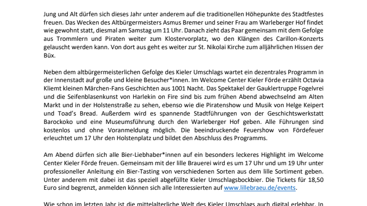 Neben dem altbürgermeisterlichen Gefolge des Kieler Umschlags wartet ein dezentrales Programm in der Innenstadt auf große und kleine Besucher*innen. Im Welcome Center Kieler Förde erzählt Octavia Kliemt kleinen Märchen-Fans Geschichten aus 1001 Nacht. Das Spektakel der Gauklertruppe Fogelvrei und die Seifenblasenkunst von Harlekin on Fire sind bis zum frühen Abend abwechselnd am Alten Markt und in der Holstenstraße zu sehen, ebenso wie die Piratenshow und Musik von Helge Keipert und Toad’s Bread. Außerdem wird es spannende Stadtführungen von der Geschichtswerkstatt Barockoko und eine Museumsführung durch den Warleberger Hof geben. Alle Führungen sind kostenlos und ohne Voranmeldung möglich. Die beeindruckende Feuershow von Fördefeuer erleuchtet um 17 Uhr den Holstenplatz und bildet den Abschluss des Programms.