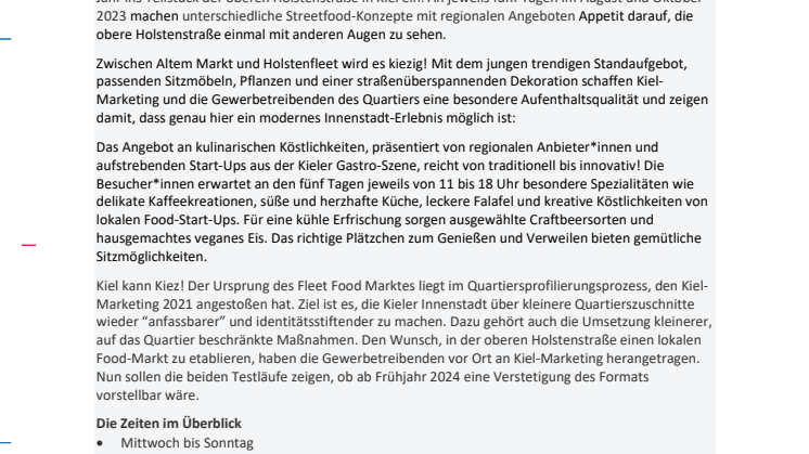 Kiel kann Kiez! Der Ursprung des Fleet Food Marktes liegt im Quartiersprofilierungsprozess, den Kiel-Marketing 2021 angestoßen hat. Ziel ist es, die Kieler Innenstadt über kleinere Quartierszuschnitte wieder “anfassbarer” und identitätsstiftender zu machen. Dazu gehört auch die Umsetzung kleinerer, auf das Quartier beschränkte Maßnahmen. Den Wunsch, in der oberen Holstenstraße einen lokalen Food-Markt zu etablieren, haben die Gewerbetreibenden vor Ort an Kiel-Marketing herangetragen. Nun sollen die beiden Testläufe zeigen, ob ab Frühjahr 2024 eine Verstetigung des Formats vorstellbar wäre.