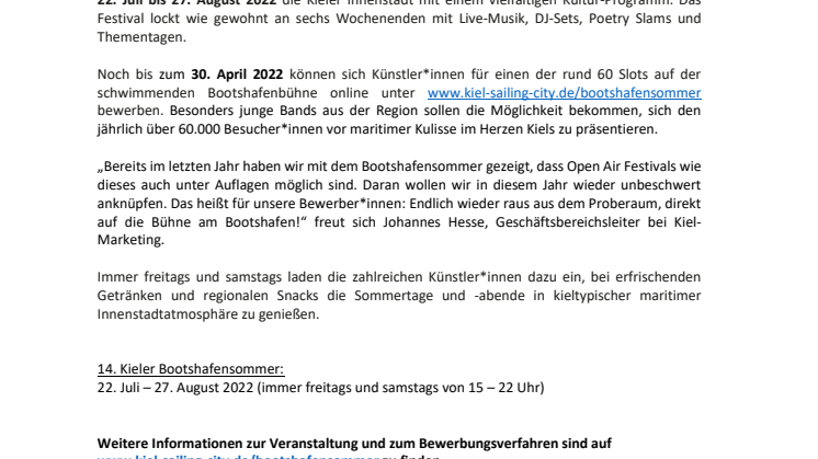 Noch bis zum 30. April 2022 können sich Künstler*innen für einen der rund 60 Slots auf der schwimmenden Bootshafenbühne online unter www.kiel-sailing-city.de/bootshafensommer bewerben. Besonders junge Bands aus der Region sollen die Möglichkeit bekommen, sich den jährlich über 60.000 Besucher*innen vor maritimer Kulisse im Herzen Kiels zu präsentieren.
