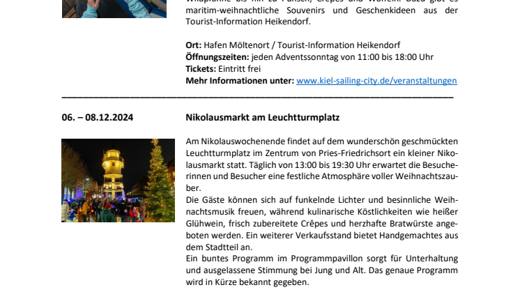 in Kiel.Sailing.City liegt Weihnachtszauber in der Luft. Im Anhang finden Sie eine Übersicht von Kiel-Marketing über Events und Angebote im Dezember 2024. Weitere Veranstaltungen finden Sie unter: www.kiel-sailing-city.de/veranstaltungen.