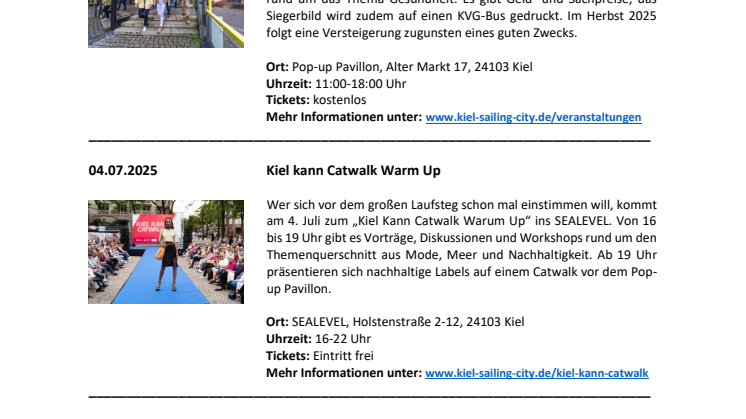 mit vielen neuen Terminen startet Kiel.Sailing.City ins Jahr 2025. Im Anhang finden Sie eine Übersicht von Kiel-Marketing über Events und Angebote im Juli 2025. Weitere Veranstaltungen finden Sie unter: