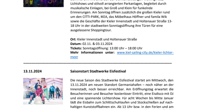 der Herbst ist vollkommen da, und der Winter bahnt sich an in Kiel.Sailing.City. Neben dem Highlightevent des Monats, dem Kieler Lichtermeer, warten die Großereignisse Kieler Weihnachtsmärkte und Stadtwerke Eisfestival auf ihre Eröffnungen. Im Anhang finden Sie eine Übersicht von Kiel-Marketing über Events und Angebote im November 2024. Weitere Veranstaltungen finden Sie unter: www.kiel-sailing-city.de/veranstaltungen.