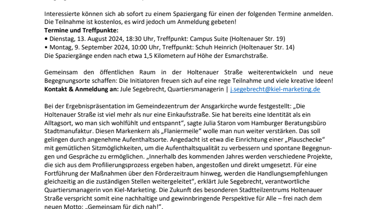 Gemeinsam den öffentlichen Raum in der Holtenauer Straße weiterentwickeln und neue Begegnungsorte schaffen: Die Initiatoren freuen sich auf eine rege Teilnahme und viele kreative Ideen! Kontakt & Anmeldung an: Jule Segebrecht, Quartiersmanagerin | j.segebrecht@kiel-marketing.de