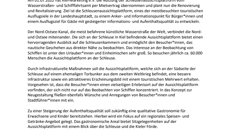 Am 01.07.2022 hat Kiel-Marketing e.V. die Nutzung der Schleusenaussichtsplattform vom Wasserstraßen- und Schifffahrtsamt per Mietvertrag übernommen und plant nun die Renovierung und Revitalisierung. Ziel ist die Schleusenaussichtsplattform, eines der meistbesuchten touristischen Ausflugsiele in der Landeshauptstadt, zu einem Anker- und Informationspunkt für Bürger*innen und einem Ausflugsziel für Gäste mit gesteigerter Informations- und Aufenthaltsqualität zu entwickeln.
