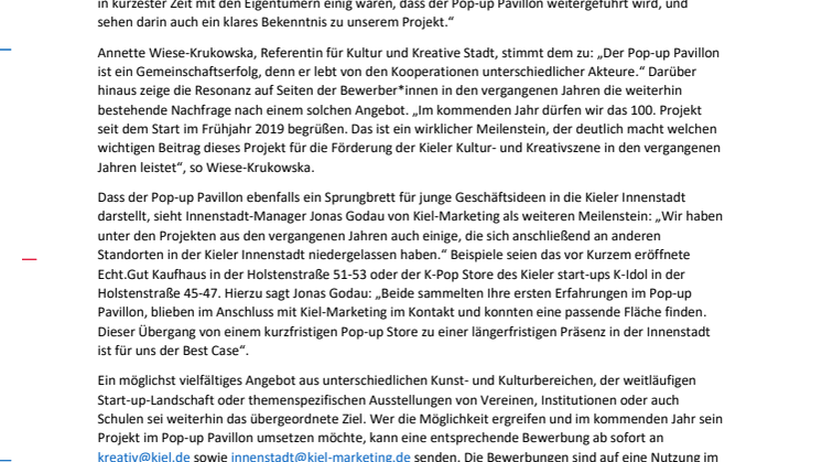 Ein möglichst vielfältiges Angebot aus unterschiedlichen Kunst- und Kulturbereichen, der weitläufigen Start-up-Landschaft oder themenspezifischen Ausstellungen von Vereinen, Institutionen oder auch Schulen sei weiterhin das übergeordnete Ziel. Wer die Möglichkeit ergreifen und im kommenden Jahr sein Projekt im Pop-up Pavillon umsetzen möchte, kann eine entsprechende Bewerbung ab sofort an kreativ@kiel.de sowie innenstadt@kiel-marketing.de senden. Die Bewerbungen sind auf eine Nutzung im Jahr 2024 und eine Nutzungsdauer von maximal vier Wochen beschränkt. Ein entsprechendes Bewerbungsformular ist auf der Website des Innenstadt-Managements zu finden. Die Bewerbungsfrist endet am 29. Oktober 2023.