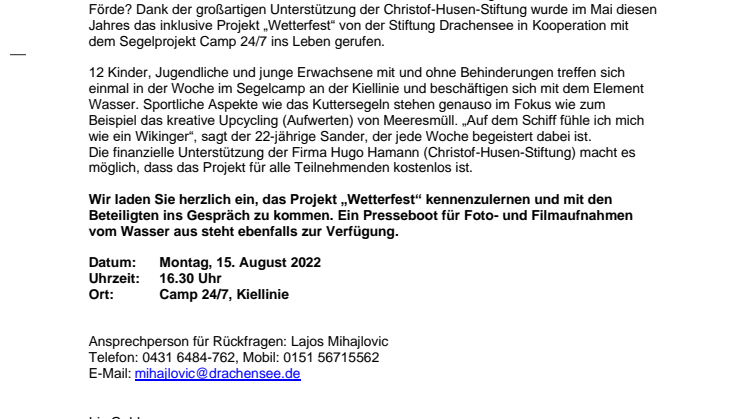 Presseeinladung für das Segelprojekt "Wetterfest" der Stiftung Drachensee