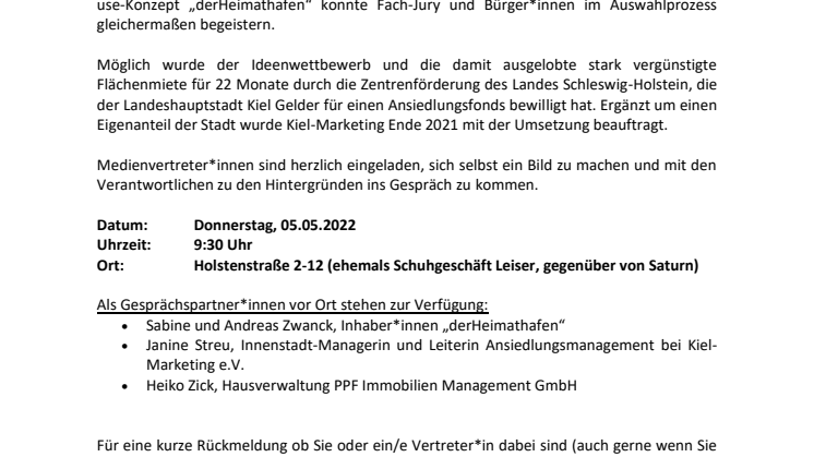 Presseeinladung für Donnerstag, 05.05.2022 | Kieler Kiezgröße gefunden