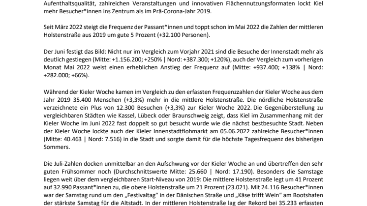 Während der Kieler Woche kamen im Vergleich zu den erfassten Frequenzzahlen der Kieler Woche aus dem Jahr 2019 35.400 Menschen (+3,3%) mehr in die mittlere Holstenstraße. Die nördliche Holstenstraße verzeichnete ein Plus von 12.300 Besuchen (+3,3%) zur Kieler Woche 2022. Die Gegenüberstellung zu vergleichbaren Städten wie Kassel, Lübeck oder Braunschweig zeigt, dass Kiel im Zusammenhang mit der Kieler Woche im Juni 2022 fast doppelt so gut besucht wurde wie die nächst bestbesuchte Stadt. Neben der Kieler Woche lockte auch der Kieler Innenstadtflohmarkt am 05.06.2022 zahlreiche Besucher*innen (Mitte: 40.463 | Nord: 7.516) in die Stadt und sorgte damit für die höchste Tagesfrequenz des bisherigen Sommers.
