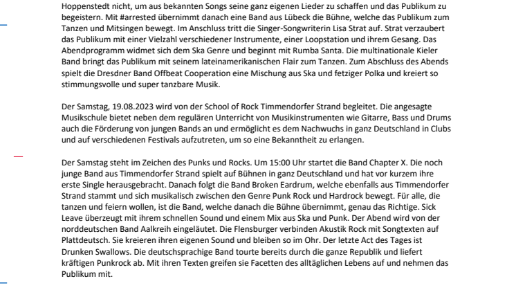 Das vorletzte Wochenende des Bootshafensommers 2023 beginnt am Freitag, 18. August um 15:00 Uhr stimmungsvoll mit dem Singer-Songwriter Daniel Hoppenstedt. Eine Loopstation, mehr braucht Daniel Hoppenstedt nicht, um aus bekannten Songs seine ganz eigenen Lieder zu schaffen und das Publikum zu begeistern. Mit #arrested übernimmt danach eine Band aus Lübeck die Bühne, welche das Publikum zum Tanzen und Mitsingen bewegt. Im Anschluss tritt die Singer-Songwriterin Lisa Strat auf. Strat verzaubert das Publikum mit einer Vielzahl verschiedener Instrumente, einer Loopstation und ihrem Gesang. Das Abendprogramm widmet sich dem Ska Genre und beginnt mit Rumba Santa. Die multinationale Kieler Band bringt das Publikum mit seinem lateinamerikanischen Flair zum Tanzen. Zum Abschluss des Abends spielt die Dresdner Band Offbeat Cooperation eine Mischung aus Ska und fetziger Polka und kreiert so stimmungsvolle und super tanzbare Musik.