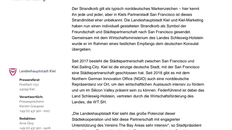 Der Strandkorb gilt als typisch norddeutsches Markenzeichen – hier kennt ihn jede und jeder, aber in Kiels Partnerstadt San Francisco ist dieses Strandmöbel eher unbekannt. Die Landeshauptstadt Kiel und Kiel-Marketing haben nun einen individuell gestalteten Strandkorb als Symbol der Freundschaft und Städtepartnerschaft nach San Francisco gesendet.