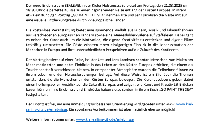 Der neue Erlebnisraum SEALEVEL in der Kieler Holstenstraße bietet am Freitag, den 21.03.2025 um 18:30 Uhr die perfekte Kulisse zu einer inspirierenden Reise entlang der Küsten Europas. In ihrem etwa einstündigen Vortrag ,,GO PAINT THE SEA“ nehmen Ute und Jens Jacobsen die Gäste mit auf eine visuelle Entdeckungsreise durch 22 europäische Länder.