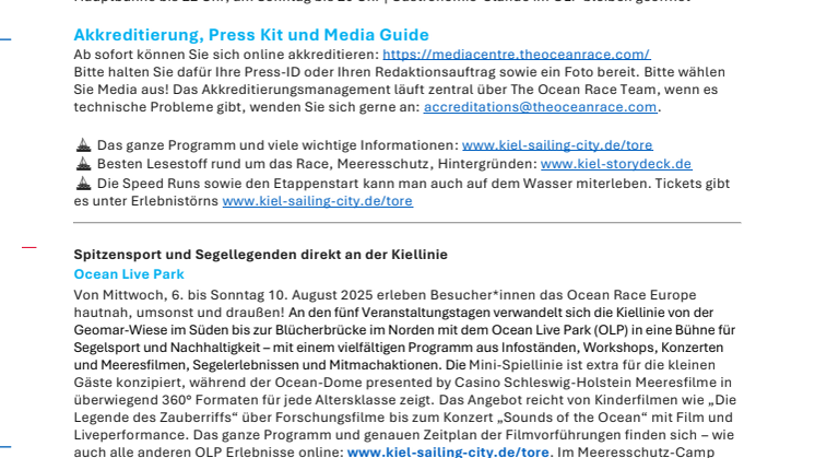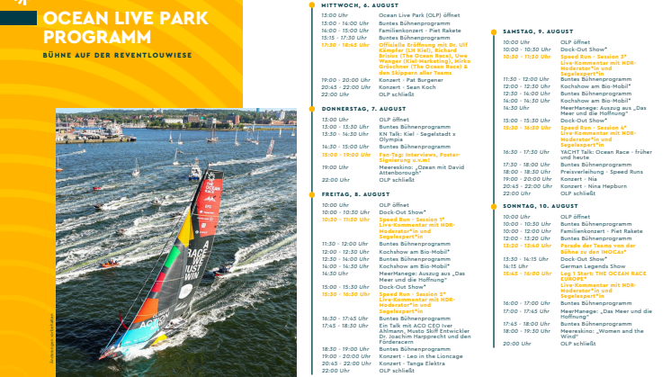 Von Mittwoch, 6. bis Sonntag 10. August 2025 erleben Besucher*innen das Ocean Race Europe hautnah, umsonst und draußen! An den fünf Veranstaltungstagen verwandelt sich die Kiellinie von der Geomar-Wiese im Süden bis zur Blücherbrücke im Norden mit dem Ocean Live Park (OLP) in eine Bühne für Segelsport und Nachhaltigkeit – mit einem vielfältigen Programm aus Infoständen, Workshops, Konzerten und Meeresfilmen, Segelerlebnissen und Mitmachaktionen. Die Mini-Spiellinie ist extra für die kleinen Gäste konzipiert, während der Ocean-Dome presented by Casino Schleswig-Holstein Meeresfilme in überwiegend 360° Formaten für jede Altersklasse zeigt. Das Angebot reicht von Kinderfilmen wie „Die Legende des Zauberriffs“ über Forschungsfilme bis zum Konzert „Sounds of the Ocean“ mit Film und Liveperformance. Das ganze Programm und genauen Zeitplan der Filmvorführungen finden sich – wie auch alle anderen OLP Erlebnisse online: www.kiel-sailing-city.de/tore. Im Meeresschutz-Camp presented by Fördesparkasse Kiel und kuratiert von Ocean Summit präsentieren sich zahlreiche NGO´s zum Thema Nachhaltigkeit und bieten Workshops zum kostenlosen Mitmachen an.