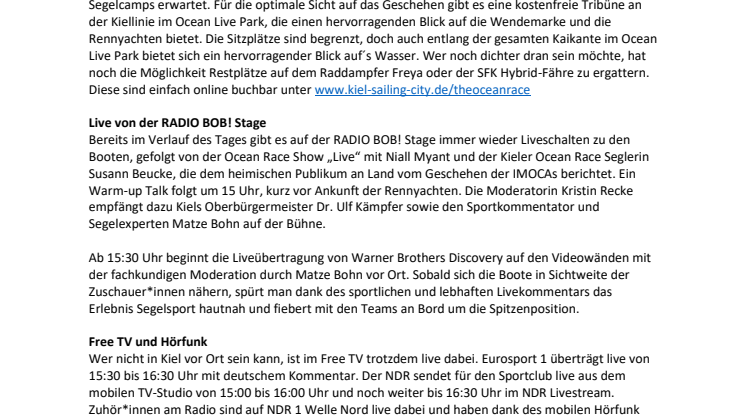 Wer nicht in Kiel vor Ort sein kann, ist im Free TV trotzdem live dabei. Eurosport 1 überträgt live von 15:30 bis 16:30 Uhr mit deutschem Kommentar. Der NDR sendet für den Sportclub live aus dem mobilen TV-Studio von 15:00 bis 16:00 Uhr und noch weiter bis 16:30 Uhr im NDR Livestream. Zuhör*innen am Radio sind auf NDR 1 Welle Nord live dabei und haben dank des mobilen Hörfunk Studios vor Ort im Ocean Live Park eine bunte Sendung von 15:00 bis 19:00 Uhr mit allem, was The Ocean Race Kiel Fly-By an Land und auf dem Wasser zu bieten hat.